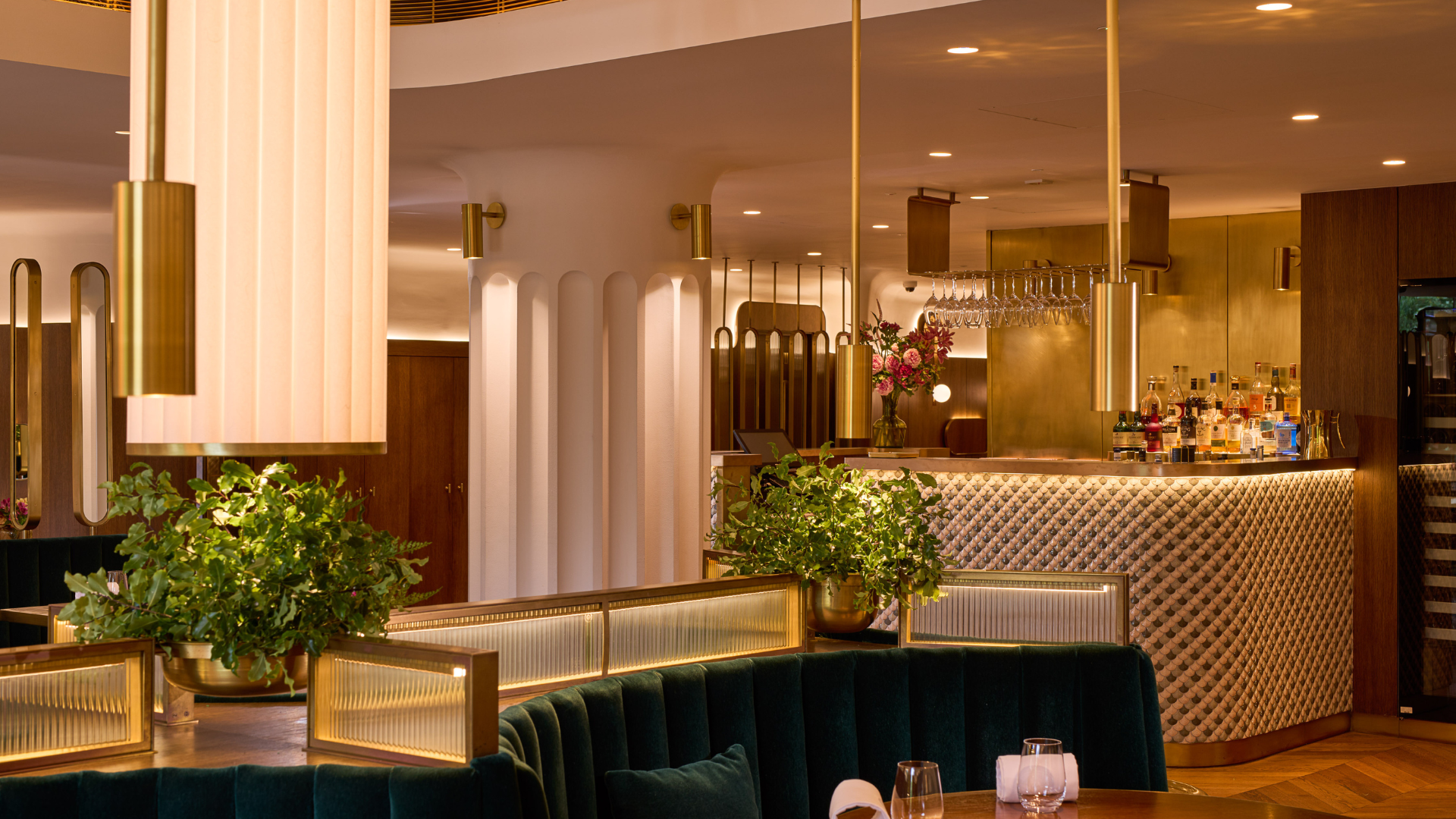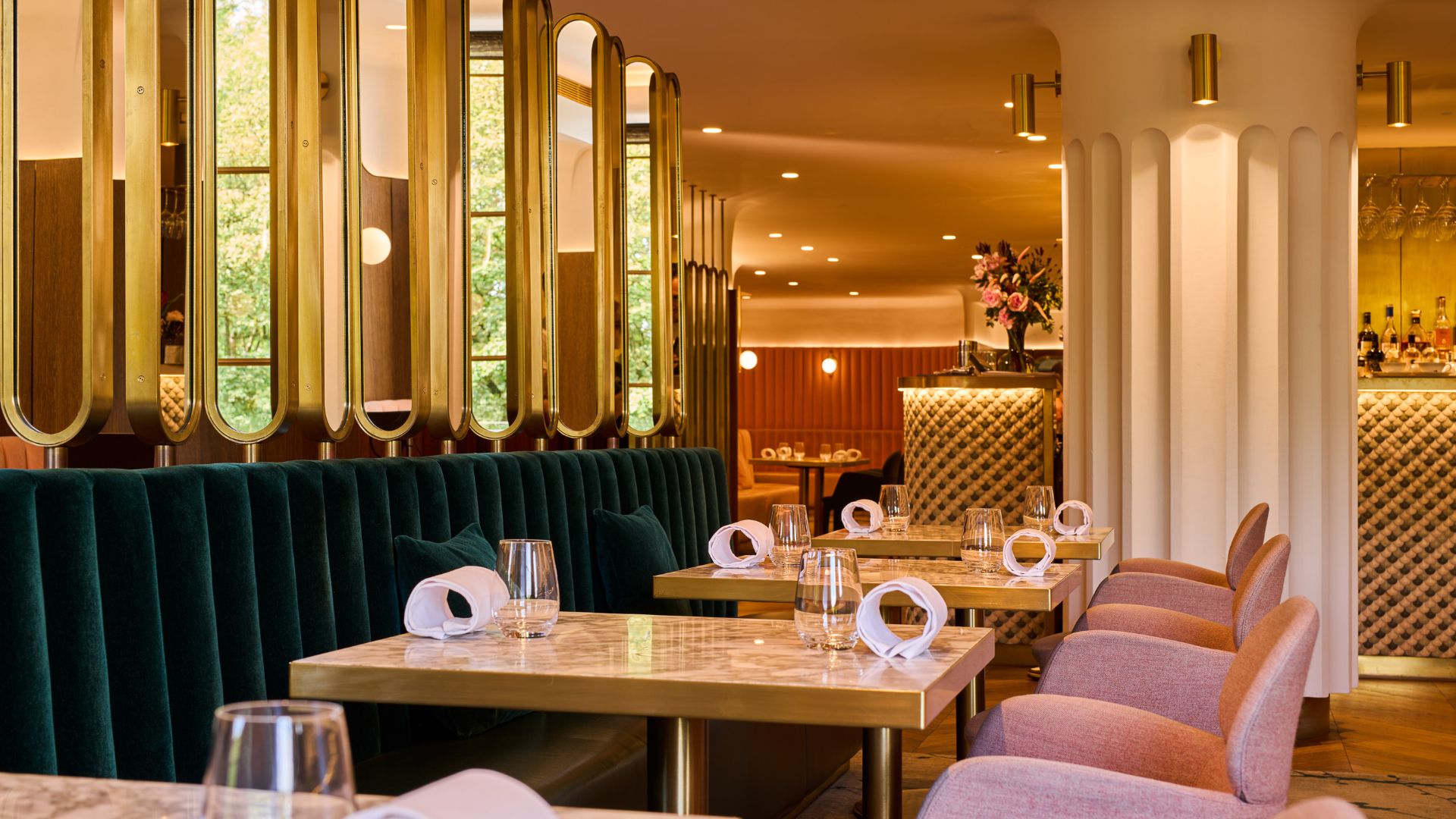 The room has a largely contemporary feel but with subtle 1930s overtones, and pink and green hues and pretty flower arrangements bring a certain softness to it.